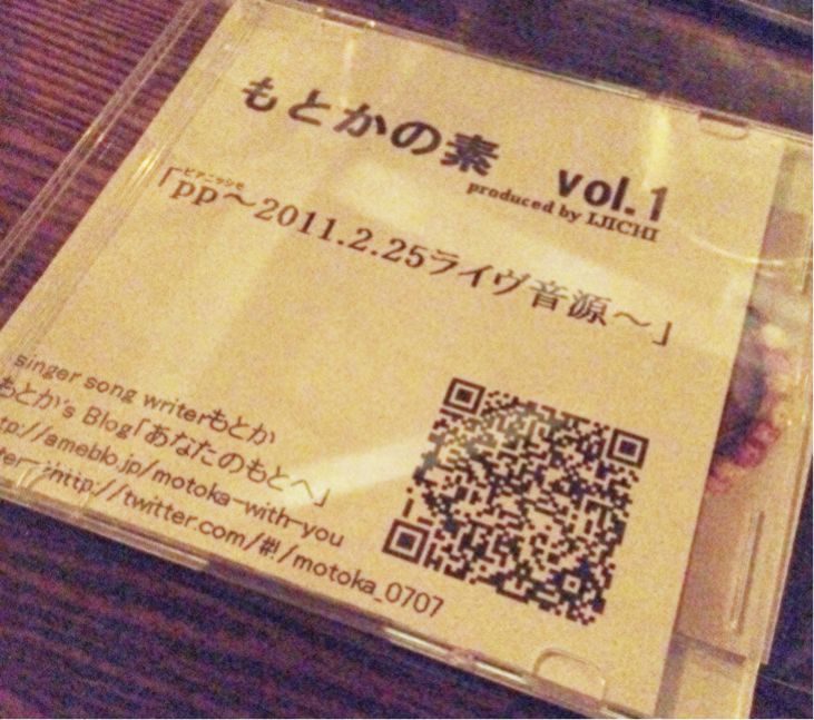 従妹のライブに行ってきたー! Category:Music Date:2011年11月12日 もとか's Blog「あなたのもとへ」ということで、従妹のライブに行ってきました!思えば、久しぶりに会ったんですが、そして実はライブに顔を出したのは初めてなんですがw幼い頃から知ってる身としては、なんか大人になったなぁとか思っちゃうわけですがw叔母さんも歌が上手いという話は親から聞いてて、でその子供の従妹なんですが。いいライブでした^^今回、たまたま急に決まったライブの日程が予定の入ってない日で、やっとライブに顔を出せた嬉しさもあるんですがw終演後、従妹とちょっと話をしてたら。CDを頂きました^^早速iPhoneにいれて聞こうと思います^^先に書いた本人のブログに今後のライブ情報もあるので、お近くの方は是非ライブに足を運んで下さい^^PR