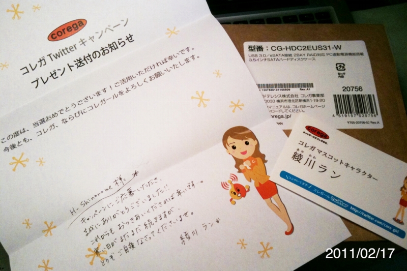 CoregaのTwitterキャンペーンに当たった♪ Category:PC Date:2011年02月17日 ついこの前まで、Coregaさんが 「女子と男子のハッピーバレンタインキャンペーン」 というものをやっていまして。 何の気なしにその対象ハッシュタグがついた発言をRTしたら、どうやらそれ一発だけで当確。。。(汗 いいのかなぁと思いながら、賞品発送連絡をしたら。。。 届くの早くね!?www 2/14 キャンペーン終了 2/15 当選連絡=>発送情報連絡返信 2/16 商品到着 かつてこれほどまでスピーディなキャンペーンは体験したことがないwww ということで、どんなモノが当たったのがご紹介^^ 当たったのは、CG-HDC2EUS31-Wという、HDD2台搭載して、RAIDやらJOBDやらをやってくれるUSB3.0/eSATA対応外付けHDDケースです。 USB3.0コネクタ、初めて見たw 中身はこんな感じ 手持ちに適当なHDDが無いので、週末にHDDを買ってこようかなと思ってます。 あと、USB3.0のIFかー。。。 ということで、次回以降ベンチマーク予定です^^ これを機にPCアップグレードすべきかな? PR
