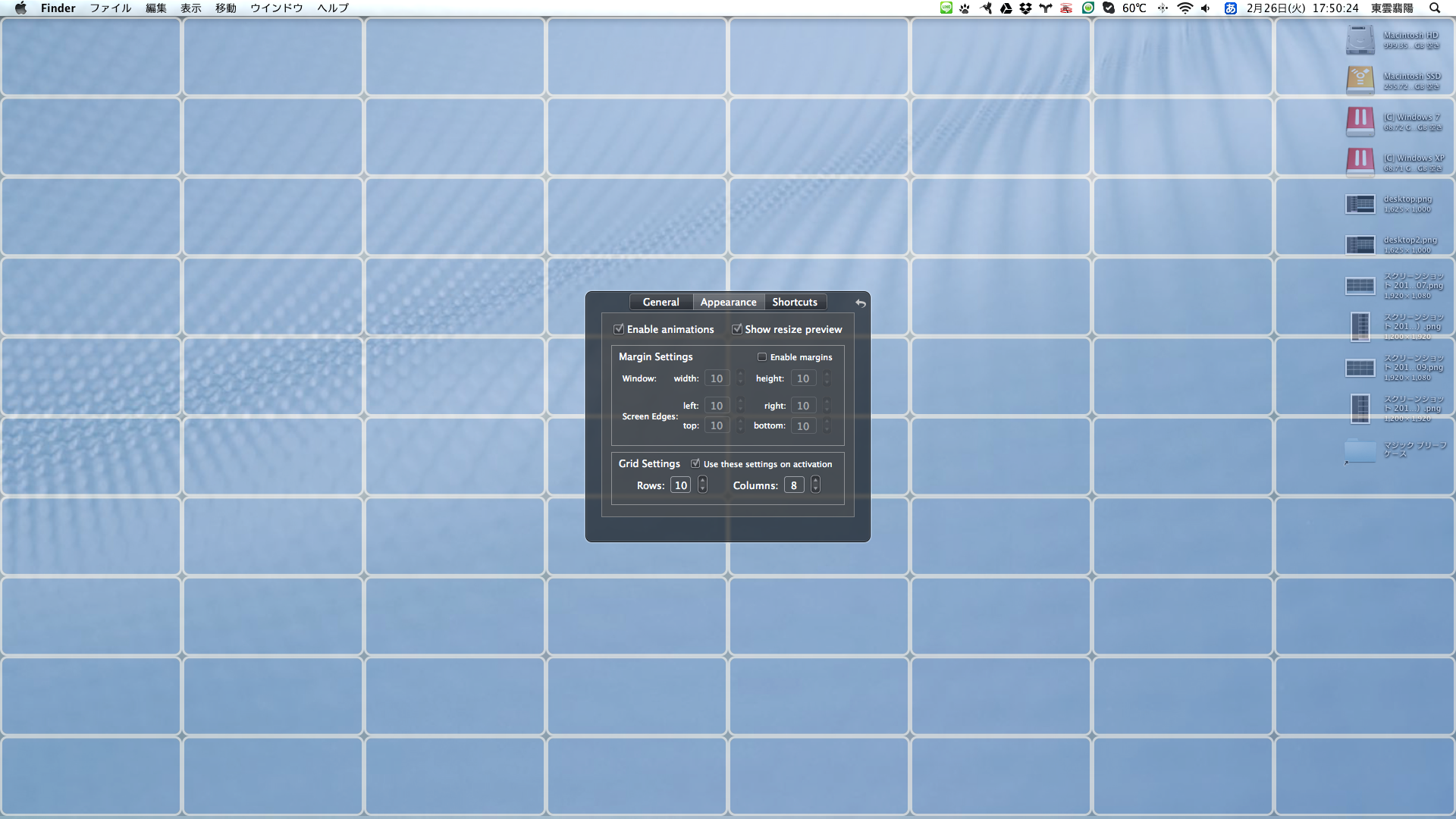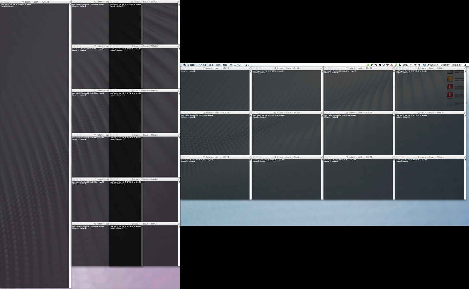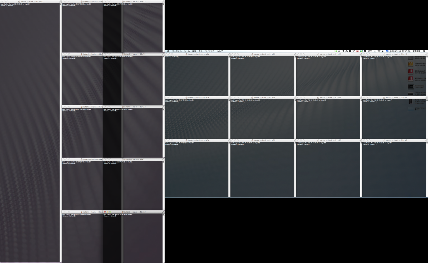 Divvy という名の効率化 Category:PC Date:2013年02月26日 参考:[Mac] ウィンドウ配置ツール “Divvy” が素敵すぎて離れられない [整頓] - oshiire*BLOG#qpstudy でもお世話になってる @sho7650 さんが、 @netmark_jp さんのおすすめとして入れてみたら素晴らしかったという話を聞いて俺も入れてみた。実は、癖というか自分のやりやすいスタイルにいろいろ工夫してみたら、ターミナルウインドウがすごい数になってしまって。これをどうにかして簡単に配置し直せ無いかなという横着な考えから。まずは、Before。メイン画面に12枚、サブ画面に13枚、合計25枚という。(これがデスクトップ2枚分あるという暴挙Divvyをつかって、整理すると、ちょっとターミナルの枚数減らしましたがこんな感じ。ぴったりきっちり、ほぼ余白無く使い切ることができます。デフォルトだと6*6の細かさなんですが、設定次第で10*10まで細かく出来ます。俺の設定はこの通り10*8です。予めよく使うようなものはショートカットにもできるので、更に楽!任意の大きさにするものドラッグで指定するだけの簡単さ。iMacやMacBook Retina、Macを大きめのディスプレイで使ってる人はぜひ使ってみては?Mac App Store : Divvy - Window Manager (¥1,200)PR