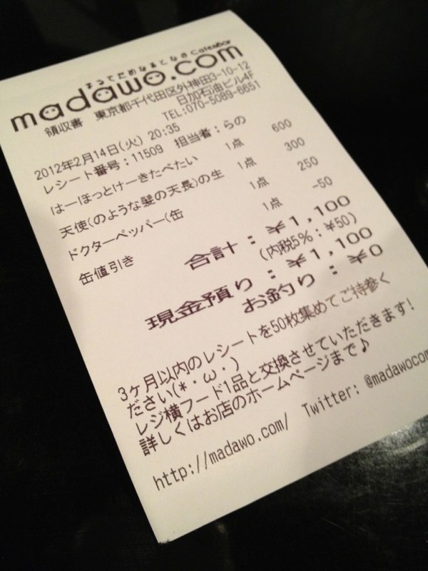 チョコが貰えるわけないので、自分でスイーツな日を演出してみることにした Category:Sweets Date:2012年02月15日 どうも、非モテ系エンジニア、東雲です。 昨日は2/14でしたね。まぁ、非モテには関係ないイベントなんですが。 ってことで、最近よく行ってる「まるでだめなおとなのCafe&Bar(通称:まだおカフェ)」でいろいろと限定スイーツがあるという情報を手にしたので昨日行ってみましたよっと! そのラインナップとは。 「天使(の様な髪の毛の天長)の生チョコレート」※2/14で終了した模様 「はー、ほっとけーきたべたい」※2/17までの限定! 「 女 性 が男らしく作ったカップケーキ」※2/14限定1000円以上購入者へのプレゼント もちろん、全てを手にれるために。 飲み物足して\1,100−なり。オーダーお願いしたときに「甘いモノばかりですが大丈夫ですか?」と聞かれたのは内緒w そして、ホットケーキが焼き上がるまで待つこと約15分… きたー!!!!! ・「はー、ほっとけーきたべたい」 雪見だいふくは安定のウマさ。 ホイップクリームは溶けちゃってたのがなぁ^^; そして、ホットケーキ3枚あったんだけど、2枚目、間のホットケーキが明らかに焦げてる(汗 焦げてないホットケーキは美味かったので、コレは作る人次第、かなぁ^^; ・「天使(の様な髪の毛の天長)の生チョコレート」 事前に「ココアパウダーでむせないように気をつけて」というPOSTを見てたので、生チョコというかチョコクリームのようなコレに一回混ぜ込んでしまおうと思い立ったので実行。 ココアでむせることもなく、美味しく頂きました^^ ・「 女 性 が男らしく作ったカップケーキ」 コレは手放しで美味しかったwプレーンの生地にチョコとマーマレードを練りこんであったのかな。 「はー、ほっとけーきたべたい」は17日まで、限定じゃない通常メニューのホットケーキもあるので、ちょっとおなかがすいたときはいいかもしれません^^ そうそう、インフラエンジニア双六も展示・販売してます。\1,200-です!お立ち寄りの際はぜひ! 参考リンク: まるでだめなおとなのCafe&Bar madawo.com (まだおカフェ:秋葉原のカフェ&バー) まだおカフェx清純派さんコラボレート企画第1弾!「はーほっとけーきたべたい」 インフラエンジニア双六、作りました! - サーバ擬人化ユーザ会PR