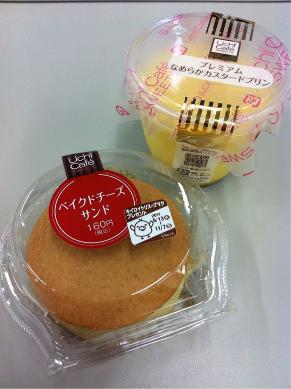 11-09-15 今日の朝スイーツ Category:Sweets Date:2011年09月15日 はい、この企画?が帰ってきました!今日はLAWSONのUchiCafeシリーズから!プレミアムなめらかカスタードプリン¥150-ベイクドチーズサンド¥160-どうやら、両方ともスプーンで食べるみたい。PR